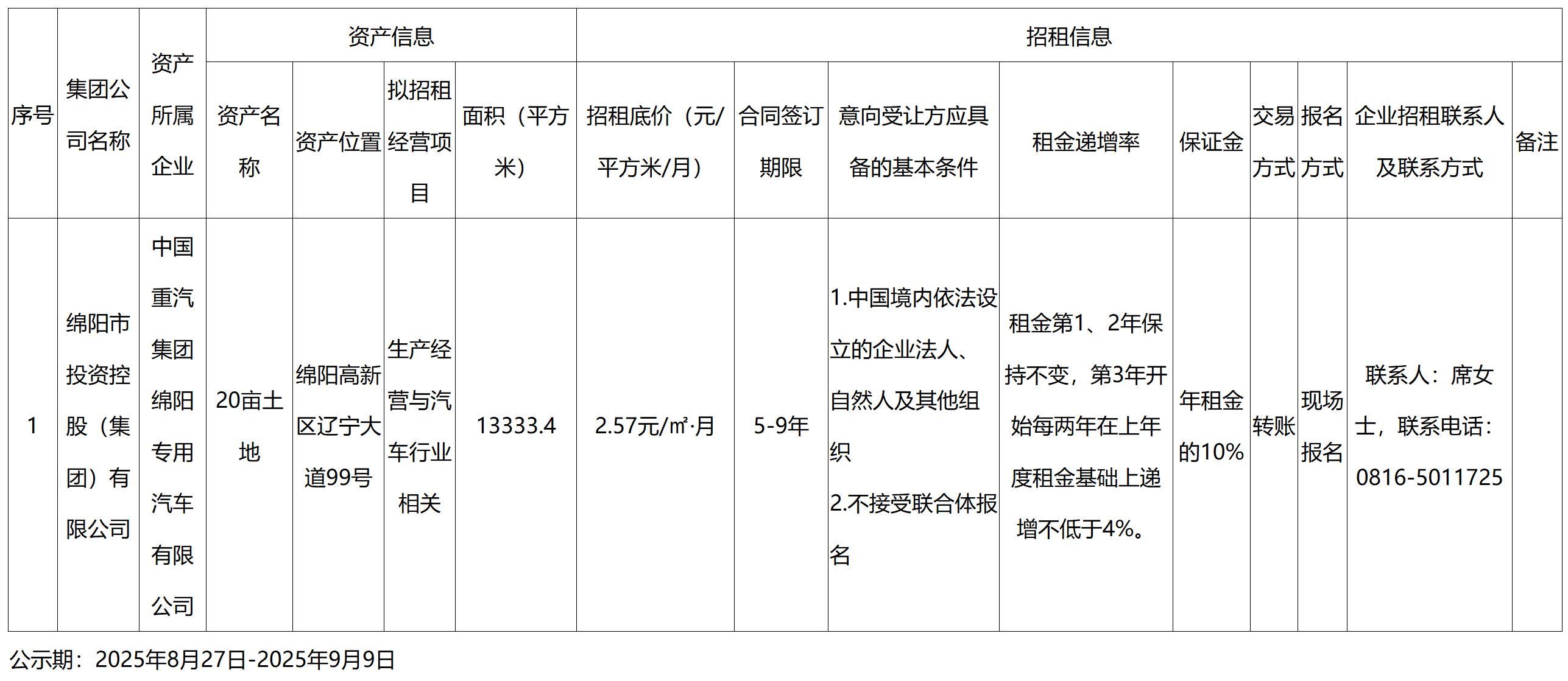 中國重汽集團綿陽專用汽車有限公司資產(chǎn)出租公告