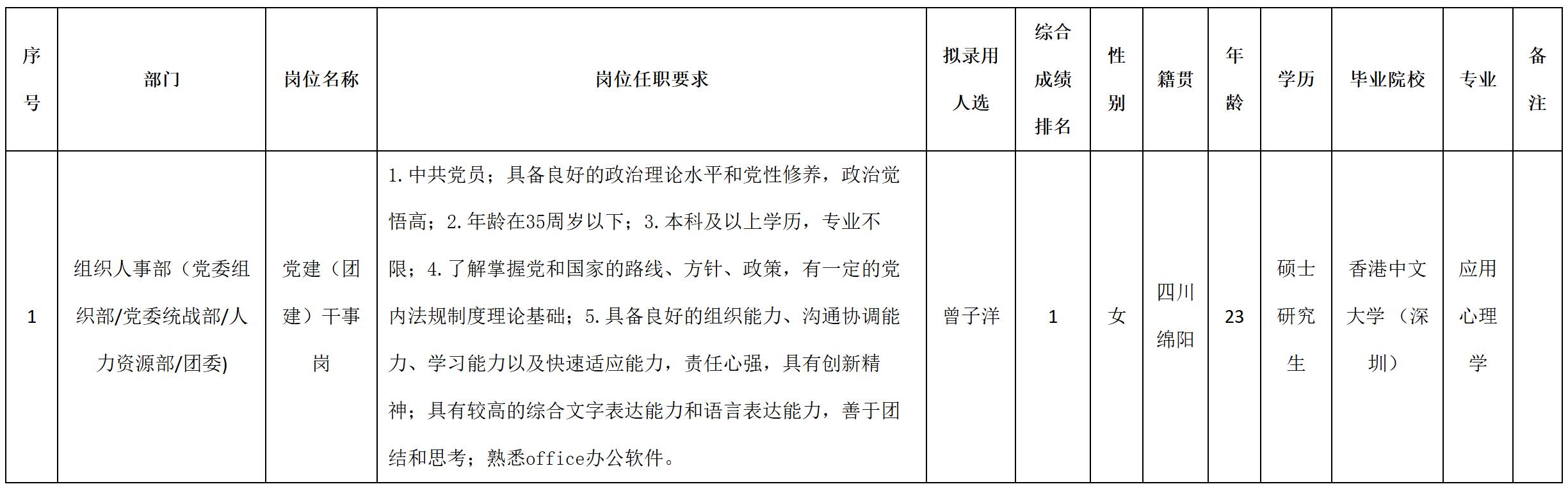 根據(jù)四川九洲投資控股集團有限公司發(fā)布的招聘公告及招聘相關(guān)規(guī)定,經(jīng)筆試、面試、考察、體檢等程序,擬錄用曾子洋同志到四川九洲投資控股集團有限公司工作,現(xiàn)予以公示,具體情況如下:
