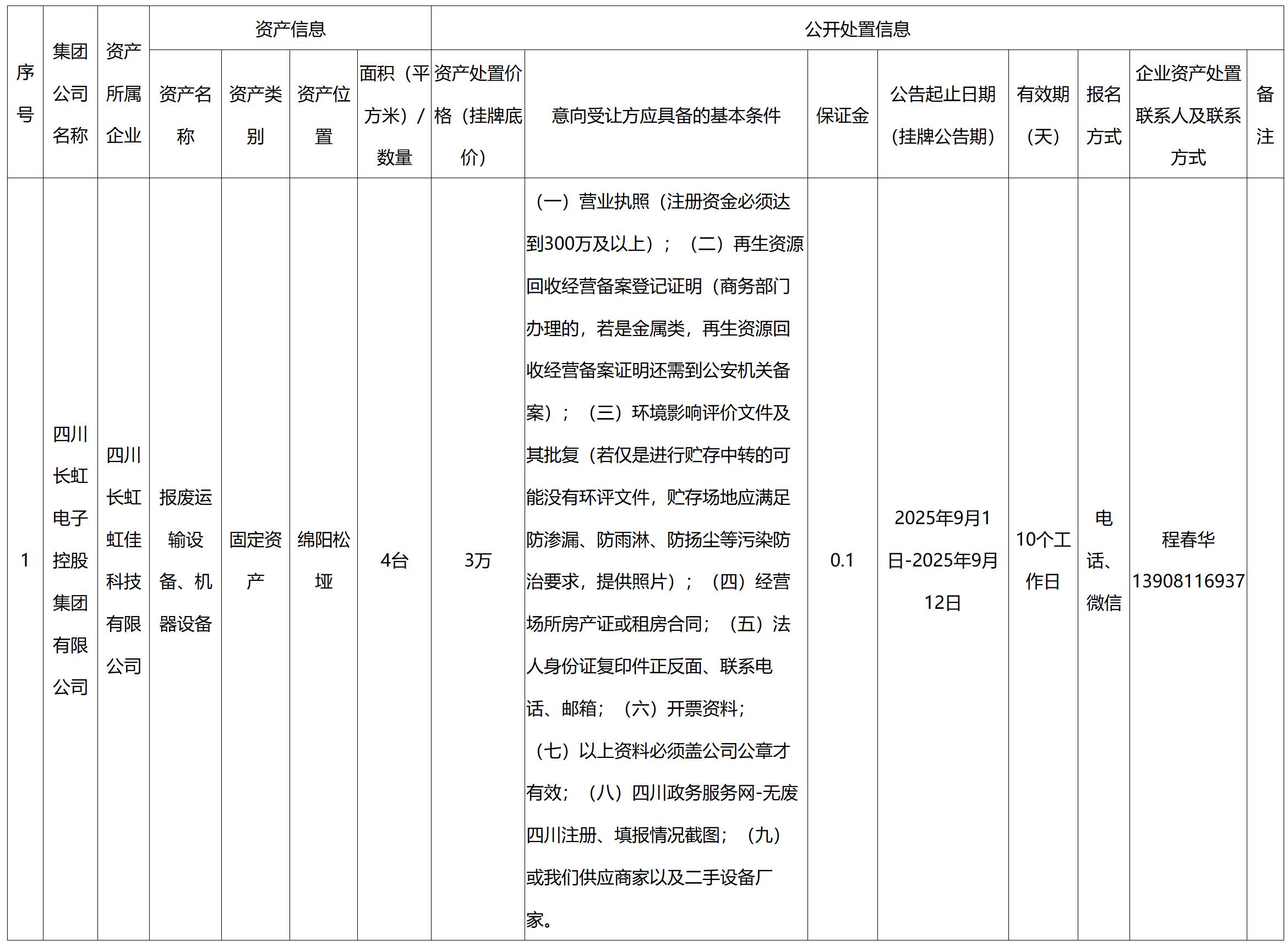 四川長虹虹佳科技有限公司資產(chǎn)處置公告