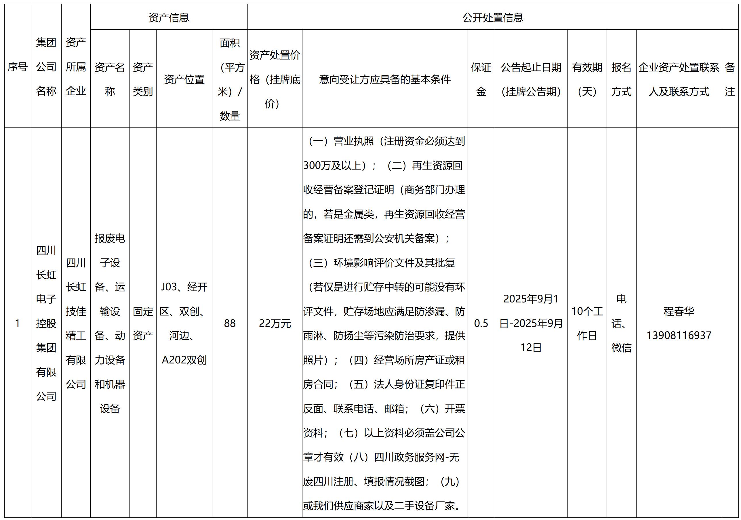 四川長(zhǎng)虹技佳精工有限公司資產(chǎn)處置公告
