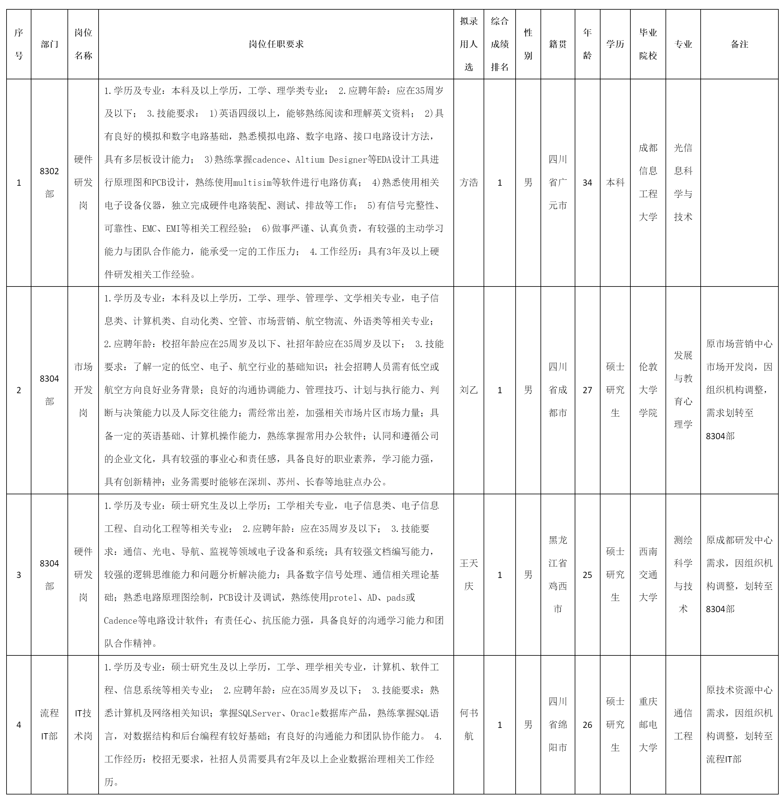 根據(jù)四川九洲空管科技有限責(zé)任公司發(fā)布的招聘公告及招聘相關(guān)規(guī)定,經(jīng)筆試、面試、考察、體檢等程序,擬錄用方浩等4名同志到四川九洲空管科技有限責(zé)任公司工作,現(xiàn)予以公示,具體情況如下: