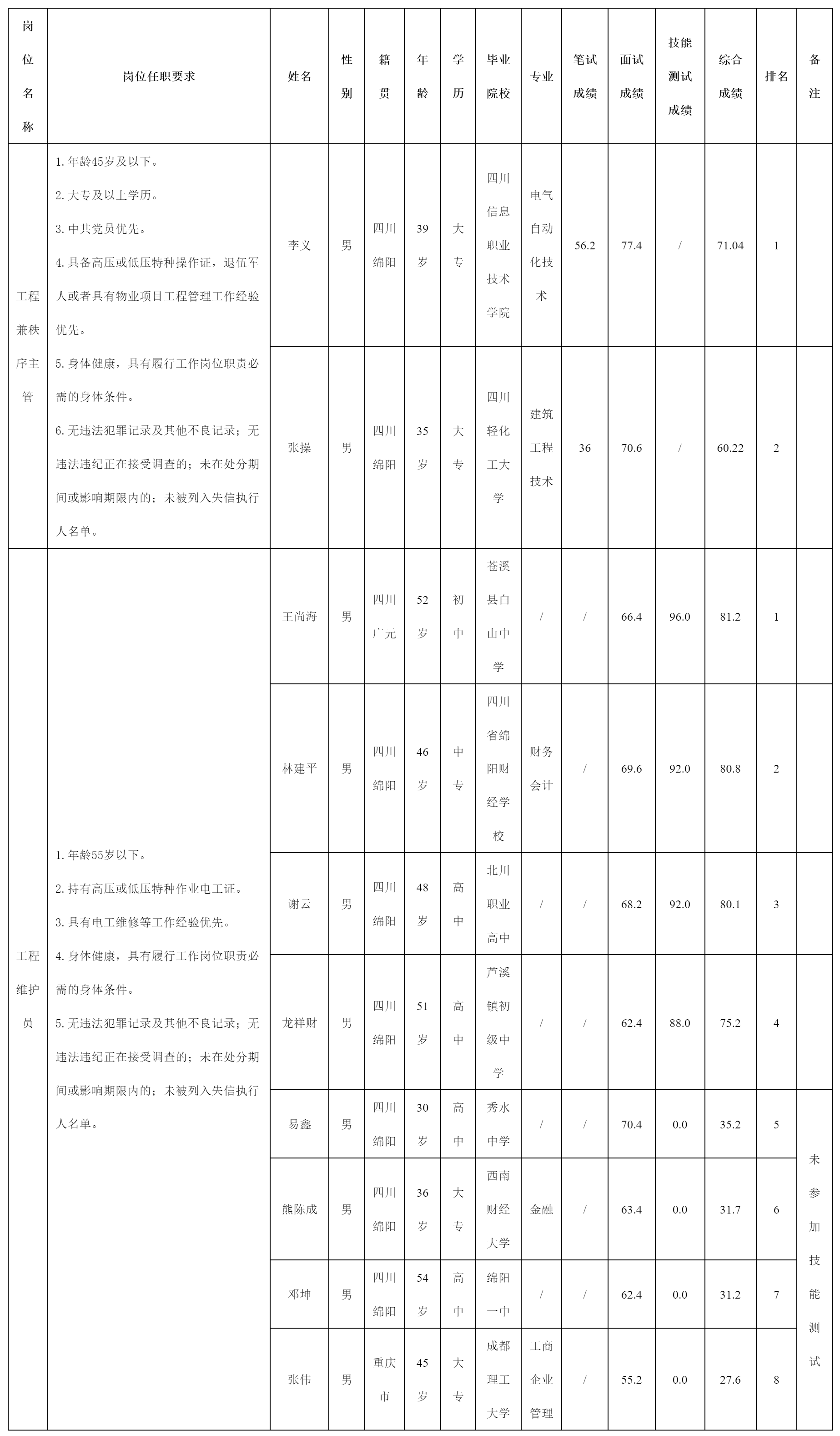 根據(jù)綿陽科發(fā)商業(yè)服務有限公司(原綿陽科發(fā)物業(yè)服務有限公司)發(fā)布的招聘公告及招聘相關(guān)規(guī)定,經(jīng)開展筆試、面試等程序,現(xiàn)將測試成績予以公示。