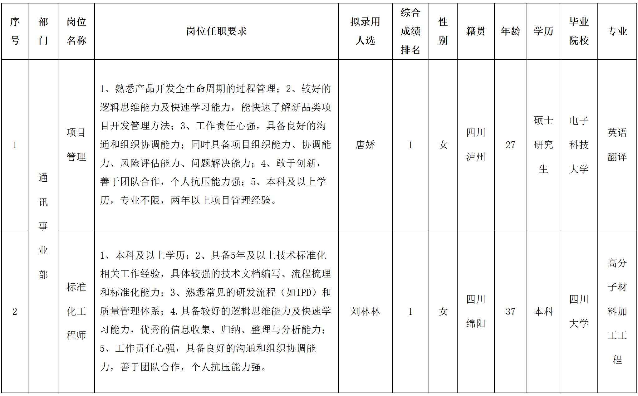 根據四川華豐科技股份有限公司發(fā)布的招聘公告及招聘相關規(guī)定,經面試等程序,擬錄用唐嬌等同志到四川華豐科技股份有限公司工作,現(xiàn)予以公示,具體情況如下:
