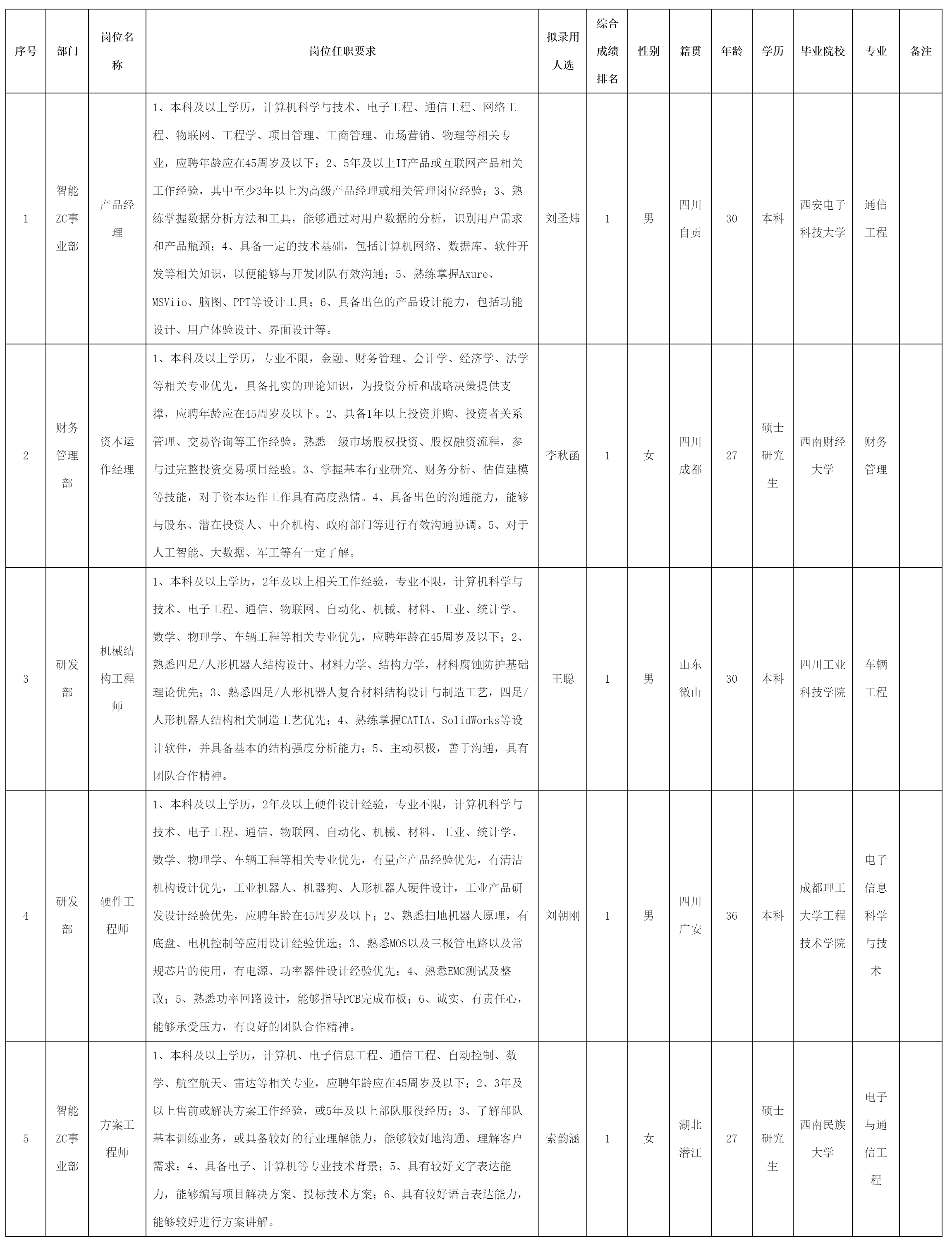 根據四川九洲投資控股集團有限公司軟件與數據智能軍團發(fā)布的招聘公告及招聘相關規(guī)定,經筆試、面試、考察、體檢等程序,擬錄用劉圣煒等5名同志到四川九洲投資控股集團有限公司軟件與數據智能軍團工作,現予以公示,具體情況如下:
