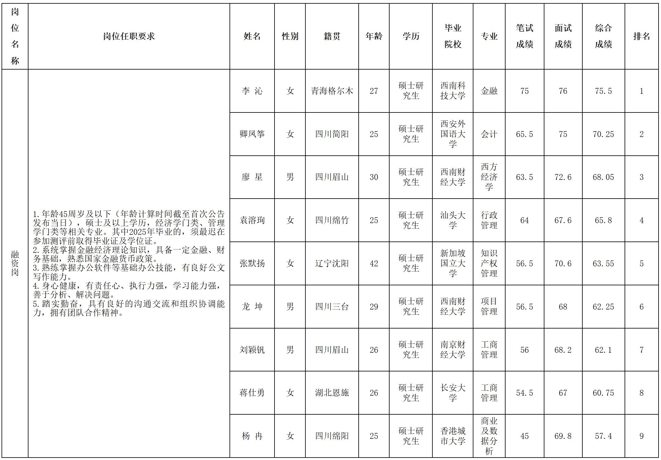 根據(jù)綿陽金控投資管理有限責(zé)任公司發(fā)布的招聘公告及招聘相關(guān)規(guī)定,經(jīng)筆試、面試等程序,現(xiàn)將筆試(面試)成績予以公示。