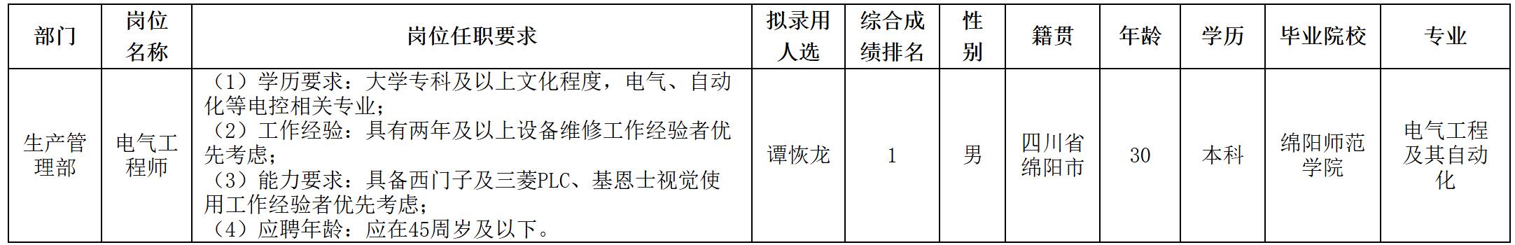 根據(jù)四川長(zhǎng)虹杰創(chuàng)鋰電科技有限公司發(fā)布的招聘公告及招聘相關(guān)規(guī)定,經(jīng)面試、考察、體檢等程序,擬錄用譚恢龍同志到長(zhǎng)虹杰創(chuàng)工作,現(xiàn)予以公示,具體情況如下:
