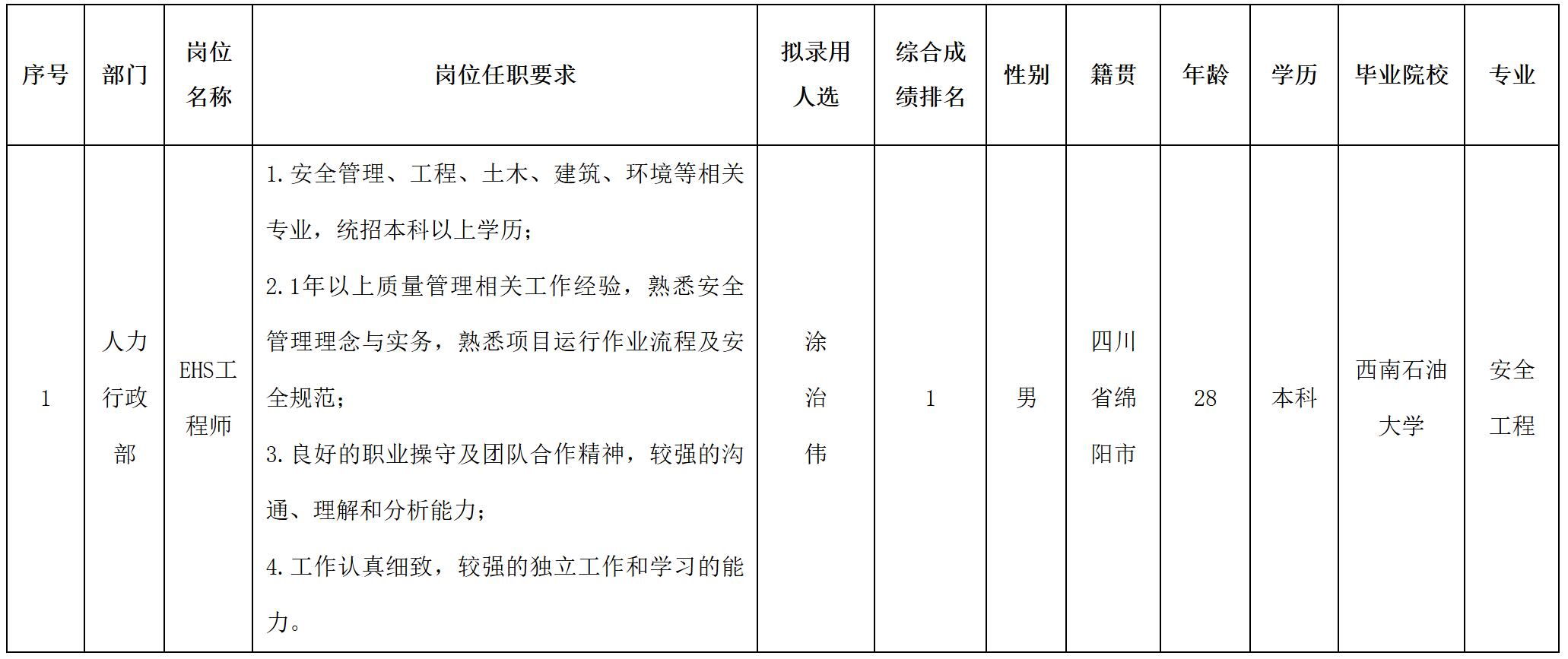 根據(jù)四川波鴻實(shí)業(yè)有限公司發(fā)布的招聘公告及招聘相關(guān)規(guī)定,經(jīng)面試、體檢等程序,擬錄用涂治偉同志到威斯卡特(綿陽)汽車零部件制造有限公司工作,現(xiàn)予以公示,具體情況如下: