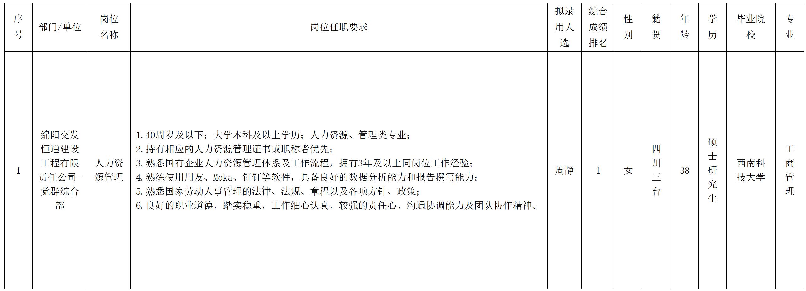 根據(jù)我司發(fā)布的招聘公告及招聘相關規(guī)定,經(jīng)初試、復試、體檢、背景調(diào)查等程序,擬錄用周靜同志到綿陽交發(fā)恒通建設工程有限責任公司工作,現(xiàn)予以公示,具體情況如下: