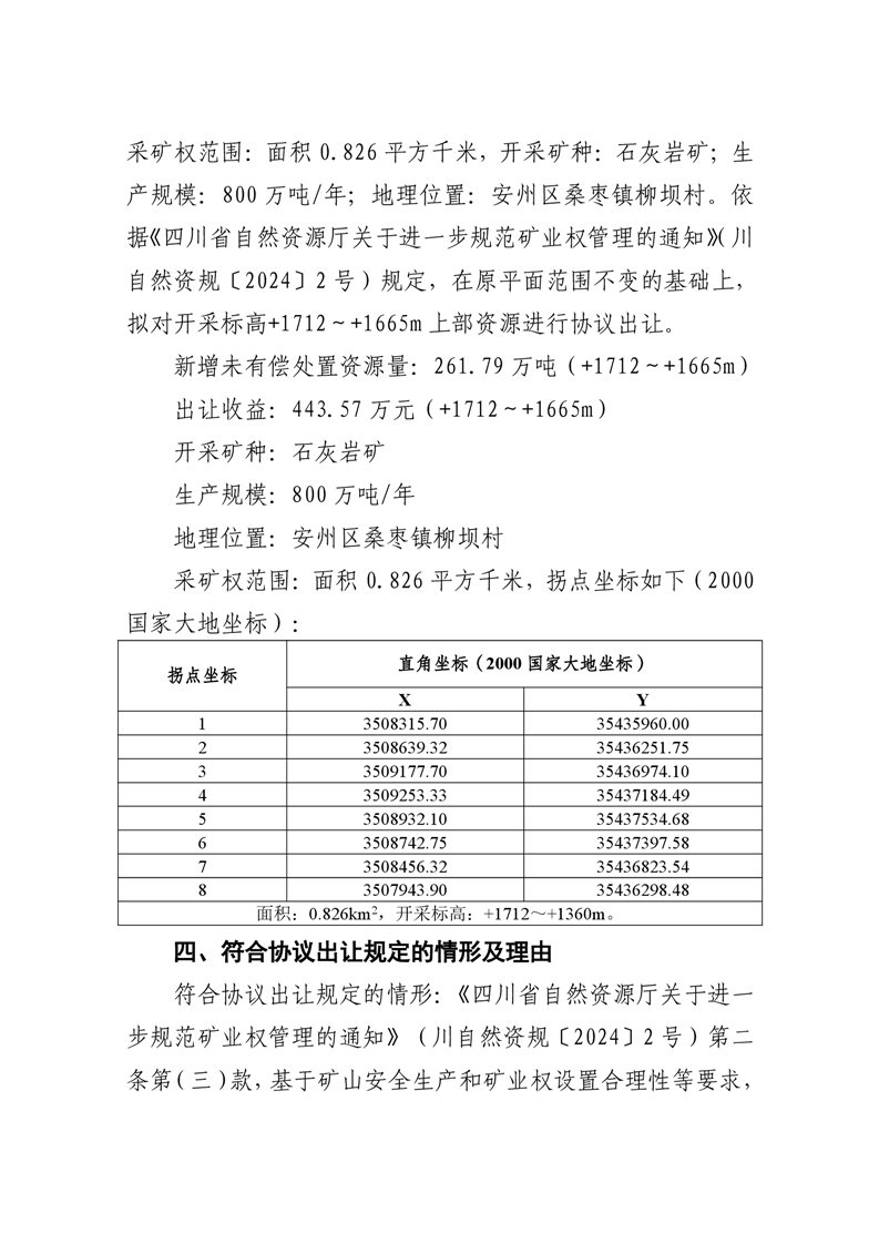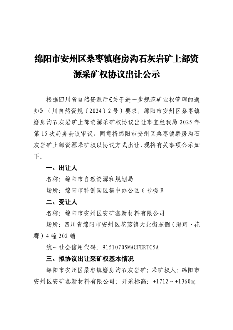 綿陽(yáng)市安州區(qū)桑棗鎮(zhèn)磨房溝石灰?guī)r礦上部資源采礦權(quán)協(xié)議出讓公示