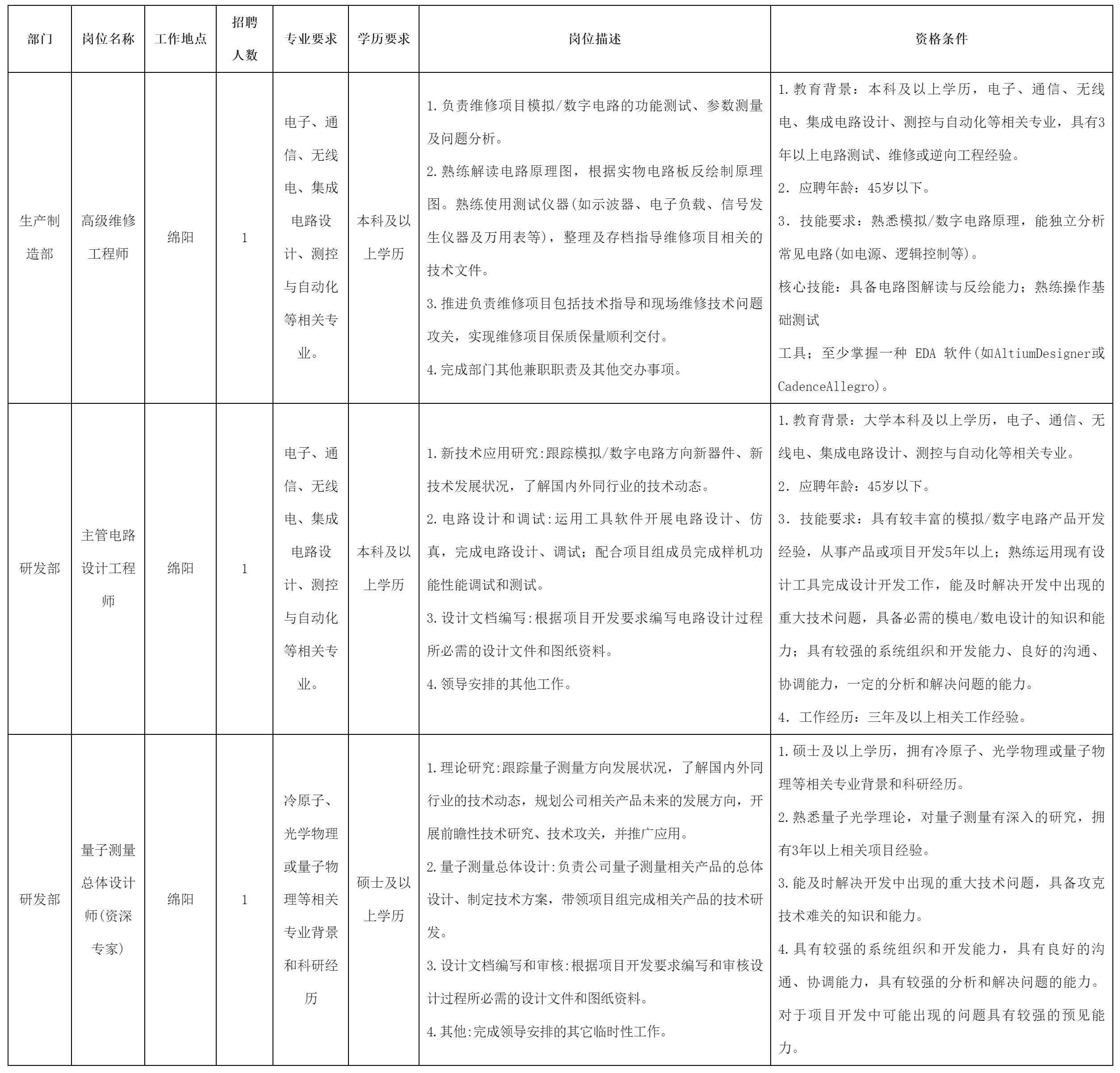 四川長(zhǎng)虹電子科技有限公司(國(guó)營(yíng)第七八〇廠)始建于1958年,是國(guó)家“一五”期間的156個(gè)重點(diǎn)項(xiàng)目之一,是我國(guó)第一個(gè)機(jī)載火控雷達(dá)科研生產(chǎn)基地,位于綿陽(yáng)市經(jīng)濟(jì)技術(shù)開(kāi)發(fā)區(qū)。公司注冊(cè)資本1.7億元人民幣,為國(guó)有獨(dú)資企業(yè)。公司主要從事重力測(cè)量、光電探測(cè)和光電告警領(lǐng)域產(chǎn)品研發(fā)和生產(chǎn)。因業(yè)務(wù)發(fā)展需要,現(xiàn)誠(chéng)聘英才,招聘崗位及要求如下: