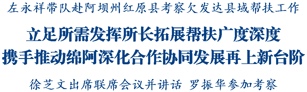 綿陽新聞網(wǎng)訊 9月15日至16日,省委常委、市委書記左永祥帶隊(duì)赴阿壩州紅原縣考察欠發(fā)達(dá)縣域幫扶工作,看望慰問我市結(jié)對幫扶干部人才代表,出席綿陽市結(jié)對幫扶阿壩州紅原縣、壤塘縣聯(lián)席會(huì)議并講話。副省長、阿壩州委書記徐芝文出席聯(lián)席會(huì)議并講話。