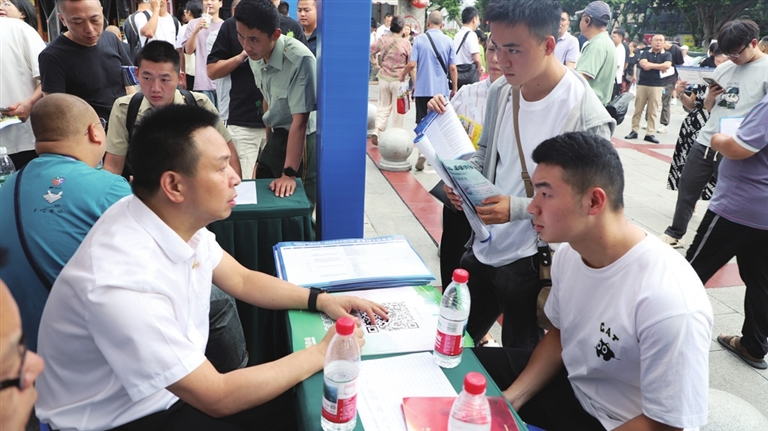 退役軍人及軍屬求職者拿著精心準備的簡歷,與用人單位招聘人員進行交流。