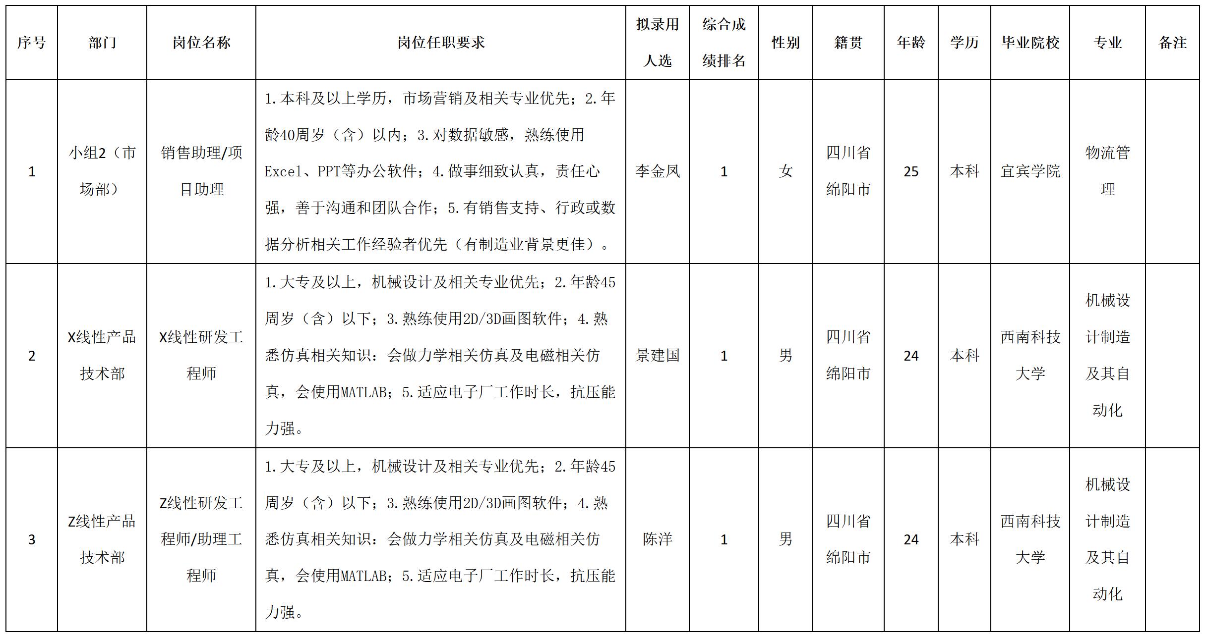 根據(jù)四川安和精密電子電器股份有限公司發(fā)布的招聘公告及招聘相關(guān)規(guī)定,經(jīng)筆試、面試、考察、體檢等程序,擬錄用李金鳳等3名同志到四川安和精密電子電器股份有限公司工作,現(xiàn)予以公示,具體情況如下: