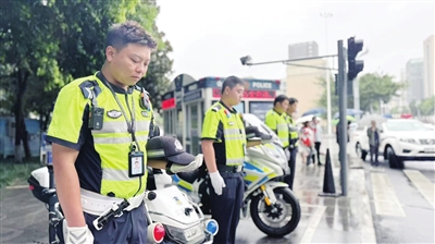 警報聲響起,執(zhí)勤交警脫帽靜立,神情莊重肅穆。