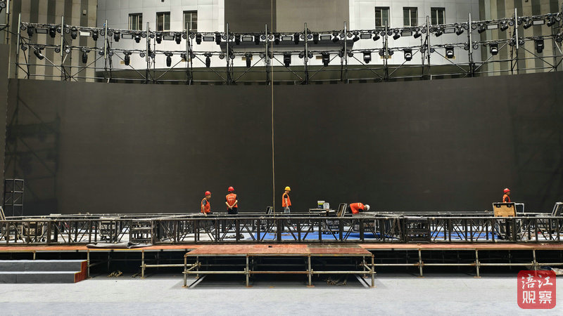 鋼琴與人形機器人背后的開幕式主舞臺上,巨大的異形主屏幕結構已初具規(guī)模,工人們正進行最后的吊頂和異形梯步搭建。綿陽科發(fā)會展旅游有限責任公司副總經理張琨向記者透露,預計將于今晚或明日凌晨完成主會場搭建工作。