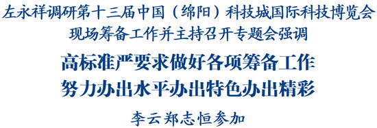 綿陽(yáng)新聞網(wǎng)訊 第十三屆中國(guó)(綿陽(yáng))科技城國(guó)際科技博覽會(huì)將于9月26日至30日舉辦,目前各項(xiàng)籌備工作已進(jìn)入沖刺階段。9月19日,省委常委、市委書(shū)記左永祥調(diào)研第十三屆科博會(huì)現(xiàn)場(chǎng)籌備工作并主持召開(kāi)專(zhuān)題會(huì)。他強(qiáng)調(diào),要深入學(xué)習(xí)貫徹習(xí)近平總書(shū)記關(guān)于科技創(chuàng)新的重要論述,全面落實(shí)黨中央和省委部署要求,堅(jiān)持系統(tǒng)觀念,加強(qiáng)協(xié)作配合,高標(biāo)準(zhǔn)、嚴(yán)要求做好第十三屆科博會(huì)各項(xiàng)籌備工作,努力辦出水平辦出特色辦出精彩。