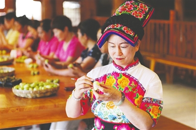 陳力菊帶領(lǐng)群眾學(xué)習(xí)雕琢套棗技藝