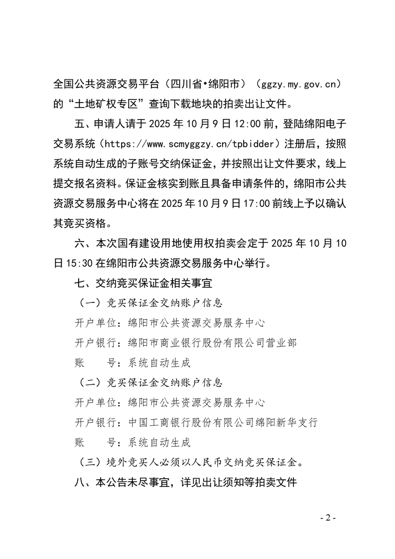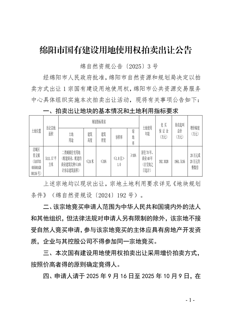 綿陽(yáng)市國(guó)有建設(shè)用地使用權(quán)拍賣(mài)出讓公告(綿自然資規(guī)公告〔2025〕3號(hào))
