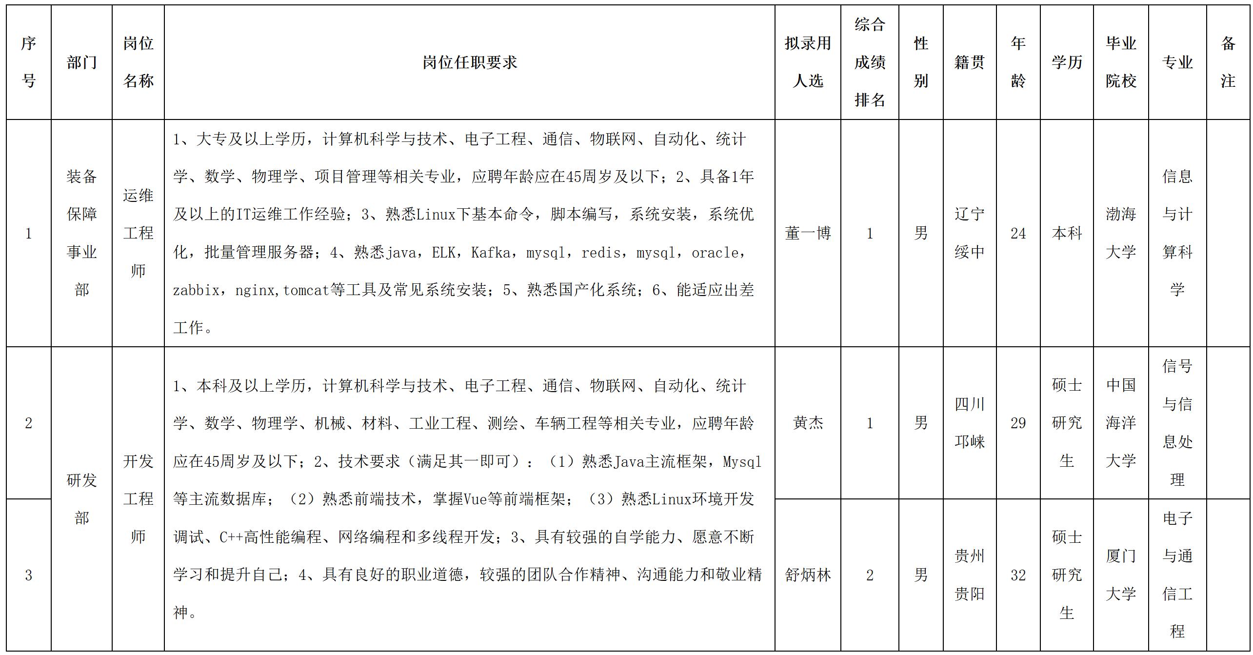 根據(jù)四川九洲投資控股集團有限公司軟件與數(shù)據(jù)智能軍團發(fā)布的招聘公告及招聘相關(guān)規(guī)定,經(jīng)筆試、面試、考察、體檢等程序,擬錄用董一博等3名同志到四川九洲投資控股集團有限公司軟件與數(shù)據(jù)智能軍團工作,現(xiàn)予以公示,具體情況如下: