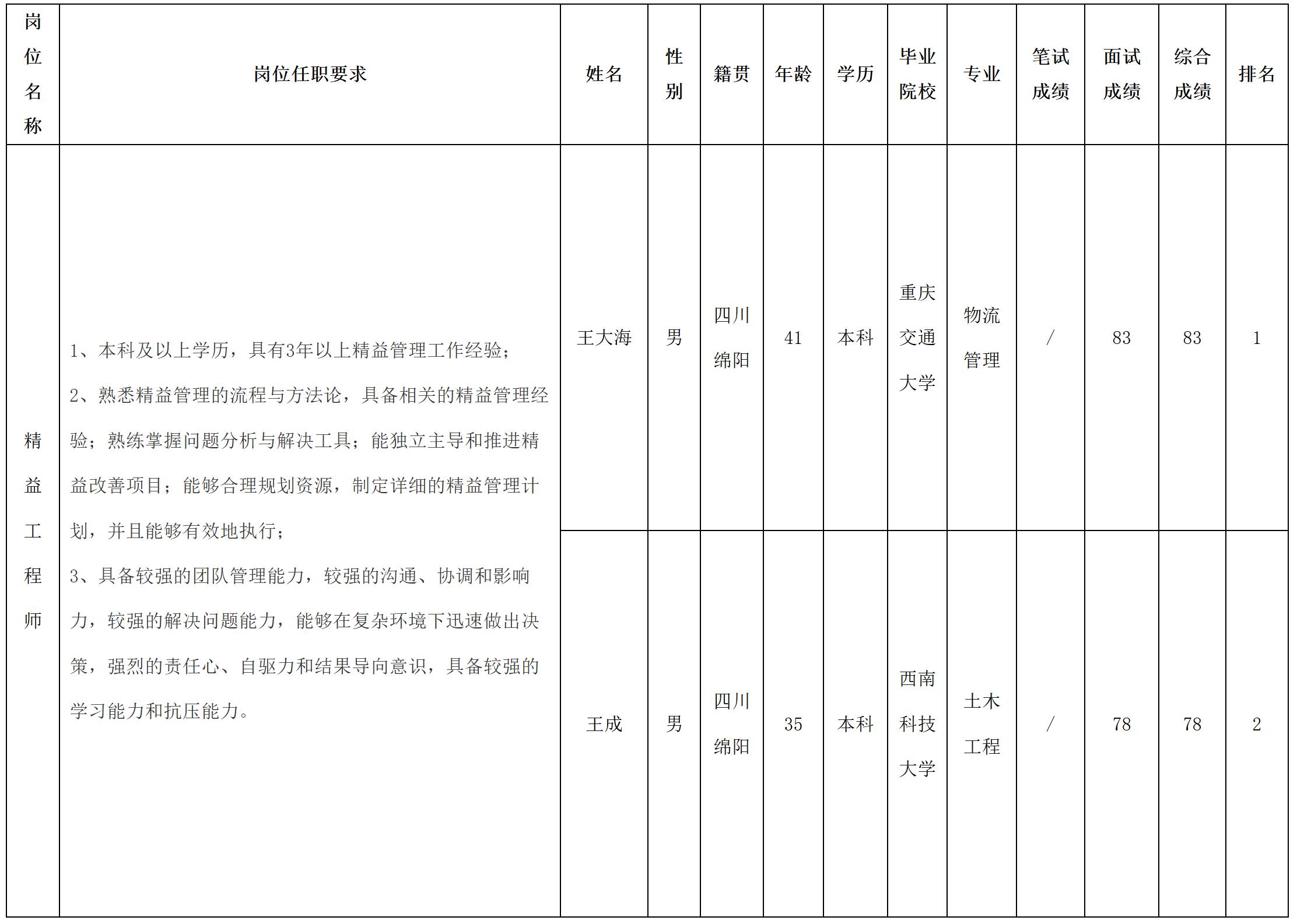 根據(jù)四川華豐科技股份有限公司發(fā)布的招聘公告及招聘相關(guān)規(guī)定,經(jīng)筆試、面試等程序,現(xiàn)將筆試(面試)成績(jī)予以公示。
