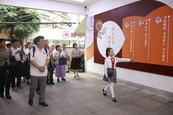綿陽新聞網(wǎng)訊 9月18日上午,三亞市中小學骨干校長50余人及西南大學、綿陽市教科所相關專家領導共計60余人組成的研修班一行到訪成綿路小學教育集團成綿校區(qū),開展了以“文脈綿延展特色 書香致遠譜新篇”為主題的參觀交流活動,共赴一場書香浸潤的教育對話。