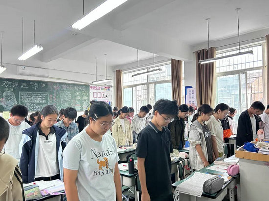 上午10時(shí)整,當(dāng)綿陽市防空警報(bào)準(zhǔn)時(shí)響起,全校各班級(jí)瞬間肅靜。全體學(xué)生應(yīng)聲起立,垂首默哀十分鐘。教室里莊重肅穆,唯有窗外的警報(bào)聲叩擊心靈,寄托著師生對革命先烈的深切哀思與崇高敬意。