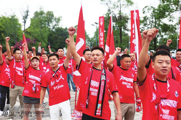 200余名球迷聯(lián)盟成員身著紅色助威服,揮舞隊(duì)旗齊聲高呼“綿陽九洲長虹隊(duì),雄起!雄起!雄起!”