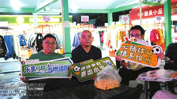 在三臺縣東方時代廣場,足球元素隨處可見,街區(qū)入口和通道兩側(cè),“樂享川超 當(dāng)燃綿陽”的綠茵主題旗幟迎風(fēng)飄揚(yáng)。東方時代廣場二期負(fù)責(zé)人魏梅介紹:“我們準(zhǔn)備了20套露營桌椅,可以容納100名球迷一起觀賽。”雖然天空飄著細(xì)雨,但這里依然聚滿了前來助威的市民。每一次進(jìn)攻、每一腳射門,都牽動著大家的心,整個商業(yè)街區(qū)變成一場盛大的露天觀賽派對!市民鮮明興奮地說:“三臺足球氛圍一直很濃,今天綿陽隊一開場氣勢就很足,非常有看頭!”