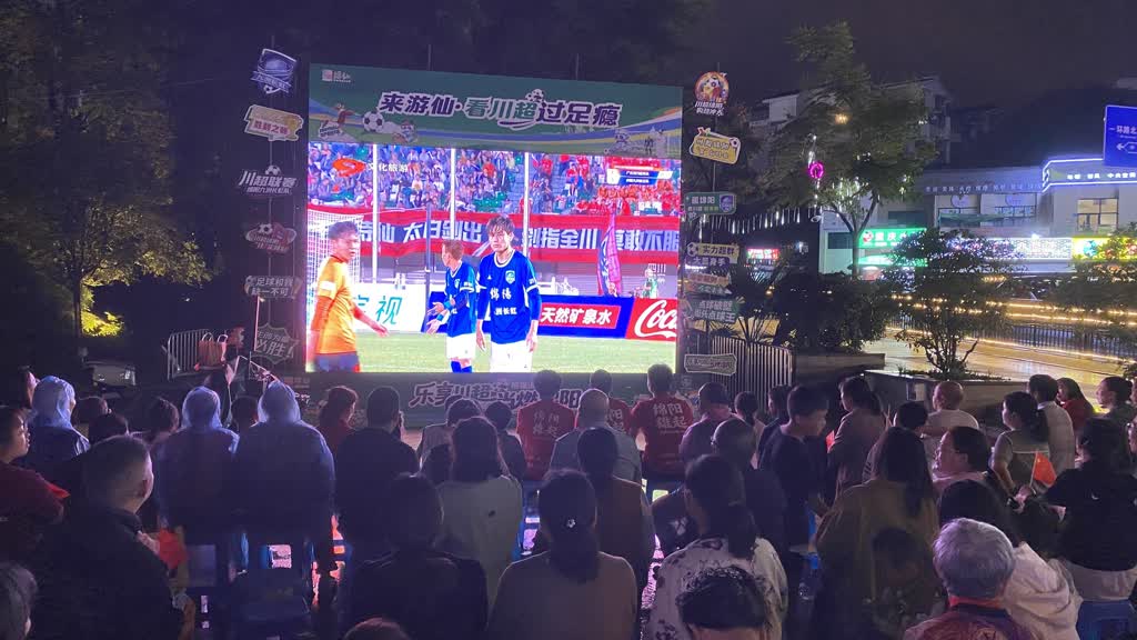 在三臺縣多個商場,大屏幕同步直播川超賽事,眾多市民聚在一起,伴著燒烤、爆米花等美食為家鄉(xiāng)球隊吶喊助威。