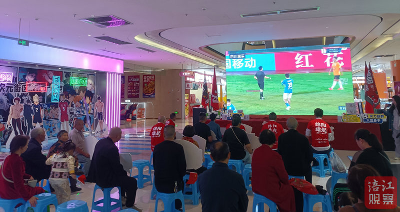 在江油市圣名購物廣場負一樓大潤發(fā)超市的顧客休息區(qū),提前設(shè)置好的大屏幕和觀看席吸引了眾多消費者和球迷駐足,一同觀看這場比賽實況轉(zhuǎn)播,為綿陽健兒加油?,F(xiàn)場裝飾著足球模型、綿陽隊隊旗和加油標語,烘托出熱烈的觀賽氛圍。