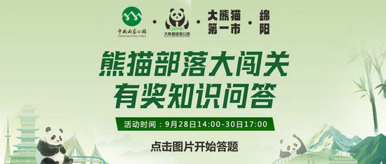 操作流程:微信搜索綿陽熊貓分局→服務(wù)→國家公園→知識問答,答對7道題即有機(jī)會抽取定制熊貓伴手禮套裝、熊貓水杯等。