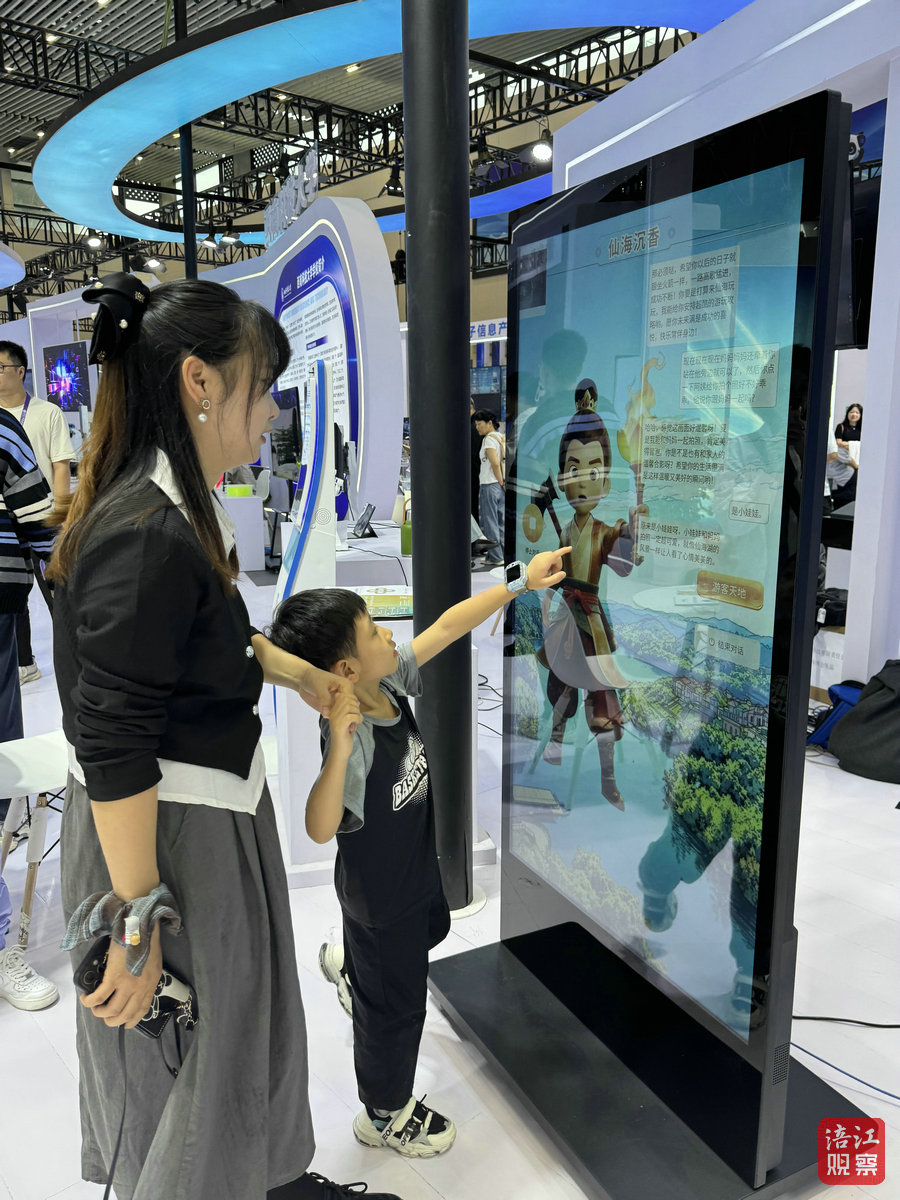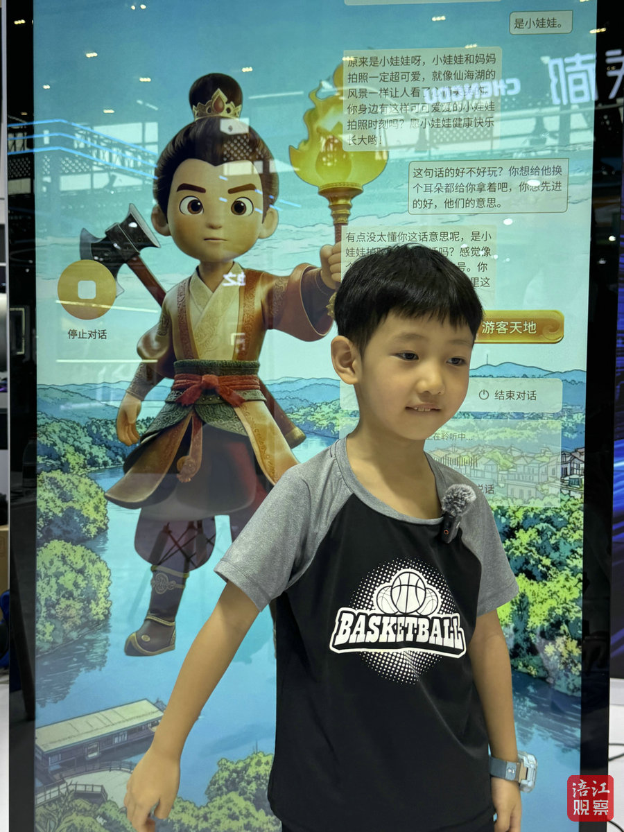 市民鄧女士帶著5歲的兒子范伽辰停步于“仙海沉香”數(shù)字人展臺(tái)前。范伽辰踮起腳輕觸屏幕上的“點(diǎn)擊喚醒”圖標(biāo),身著傳統(tǒng)服飾的“沉香”瞬間“活”了過(guò)來(lái)。這正是人工智能技術(shù)落地文旅場(chǎng)景的生動(dòng)縮影。