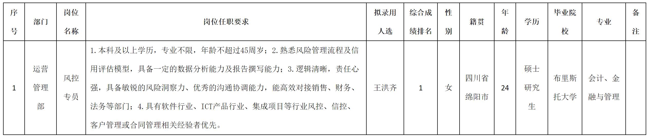 根據(jù)四川科瑞軟件有限責(zé)任公司發(fā)布的招聘公告及招聘相關(guān)規(guī)定,經(jīng)面試、考察、體檢等程序,擬錄用王洪齊同志到四川科瑞軟件有限責(zé)任公司工作,現(xiàn)予以公示,具體情況如下: