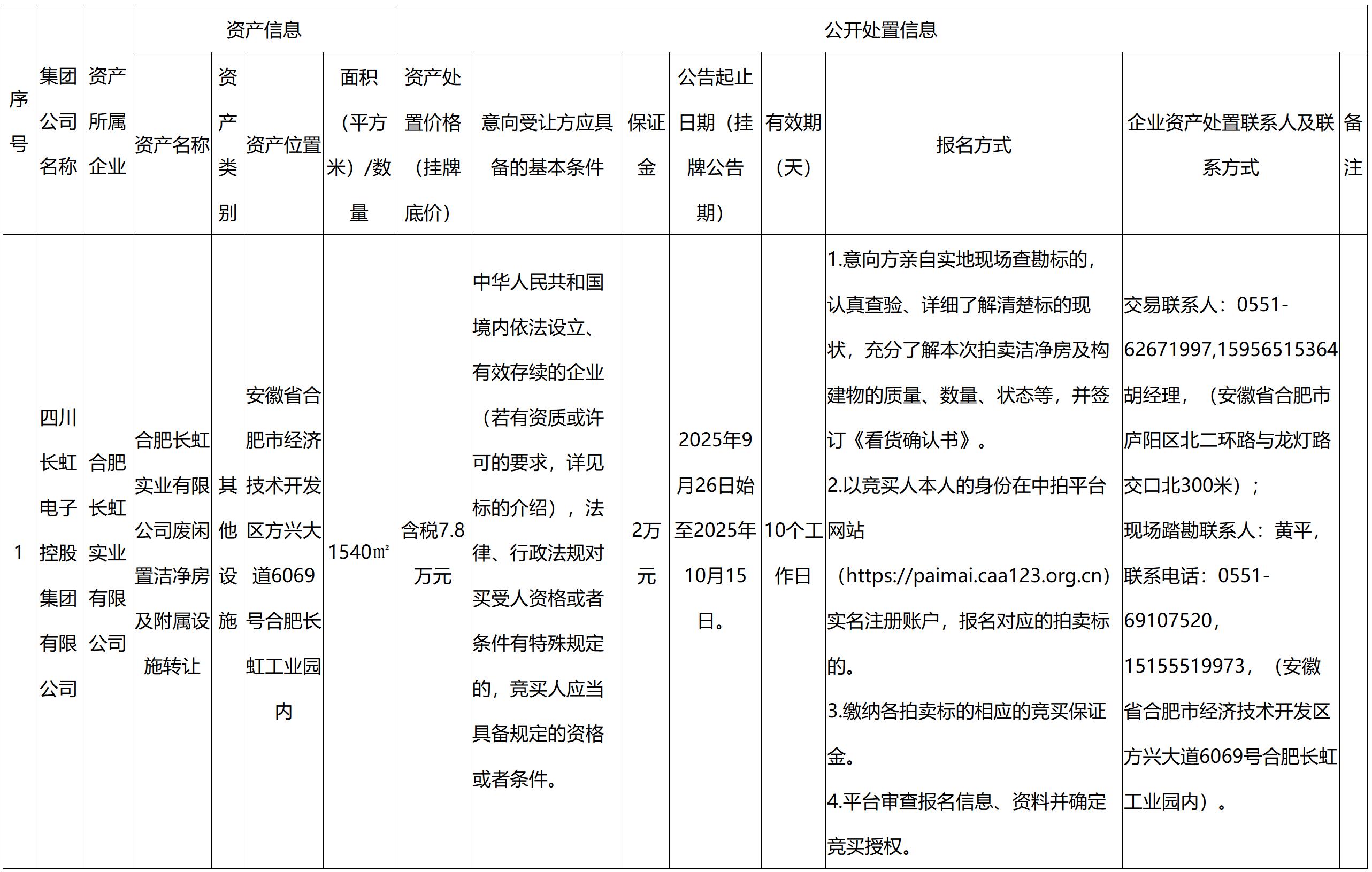 合肥長虹實業(yè)有限公司閑置資產(chǎn)處置公告