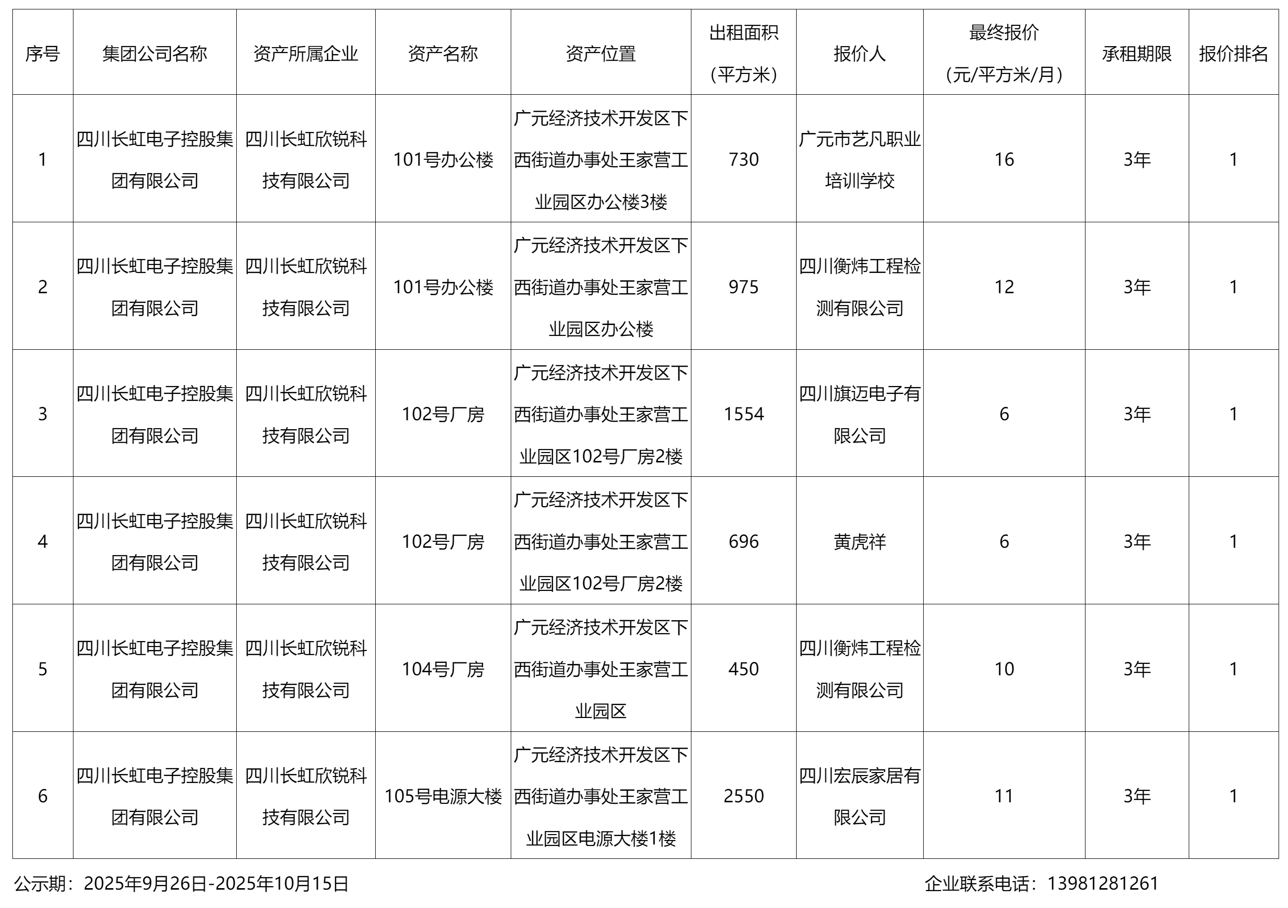 四川長(zhǎng)虹欣銳科技有限公司資產(chǎn)出租結(jié)果公示