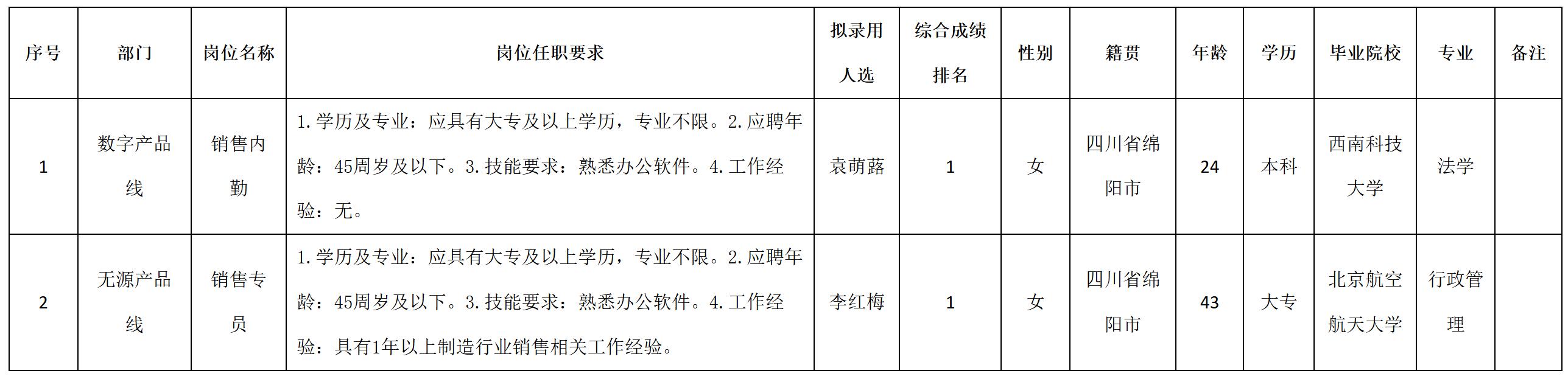 根據(jù)四川九州光電子技術(shù)有限公司發(fā)布的招聘公告及招聘相關(guān)規(guī)定,經(jīng)測試、考察、體檢等程序,擬錄用袁萌蕗等2名同志到四川九州光電子技術(shù)有限公司工作,現(xiàn)予以公示,具體情況如下: