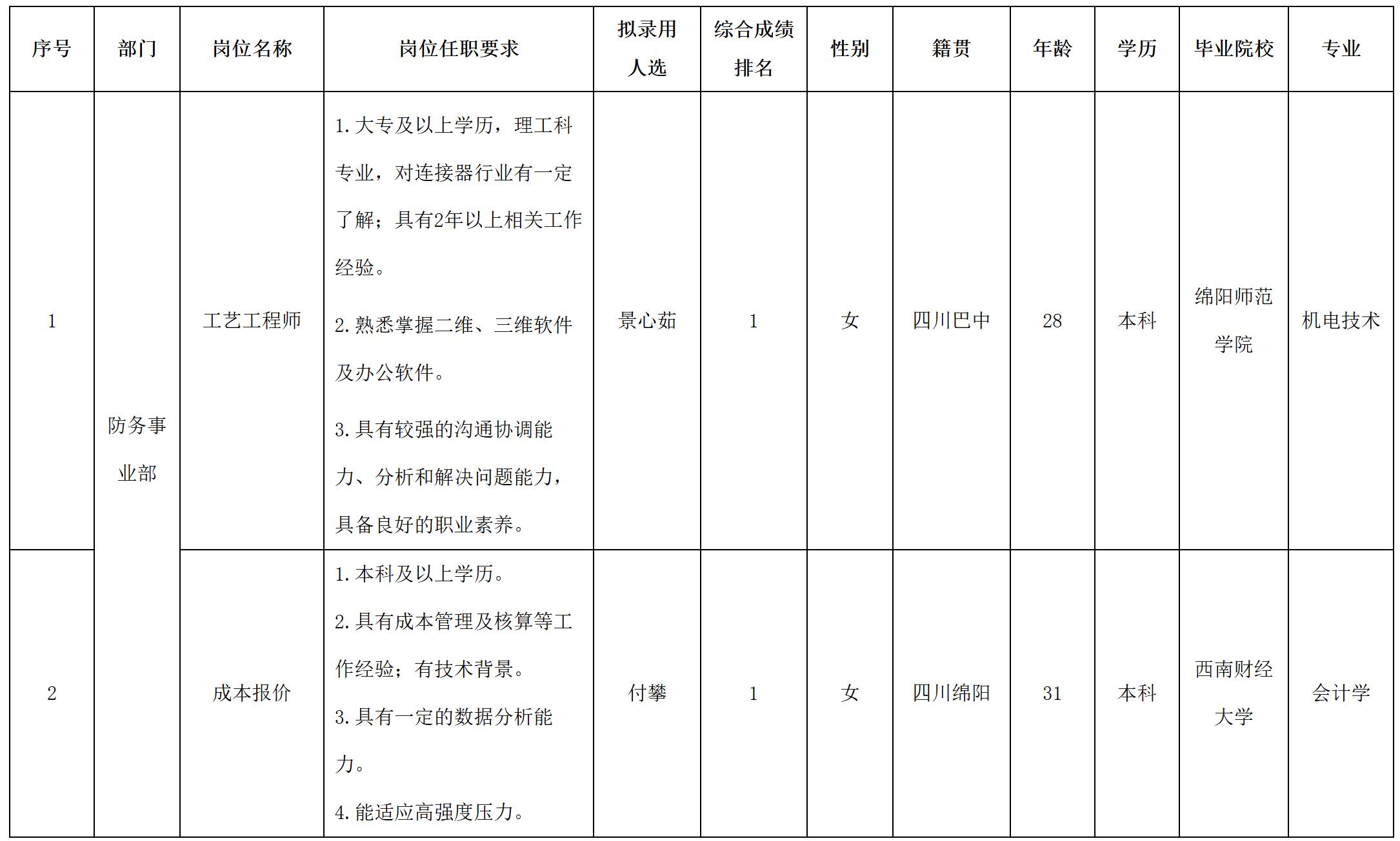 根據(jù)四川華豐科技股份有限公司發(fā)布的招聘公告及招聘相關(guān)規(guī)定,經(jīng)測試、考察、體檢等程序,擬錄用景心茹等同志到四川華豐科技股份有限公司工作,現(xiàn)予以公示,具體情況如下: