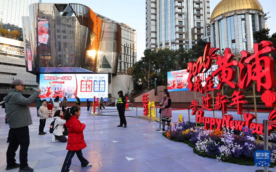 1月3日,市民游客在上海南京東路步行街世紀(jì)廣場上的春節(jié)裝飾前拍照。新華社記者 方喆 攝