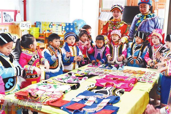 幼兒園老師向孩子們講解羌繡作品。