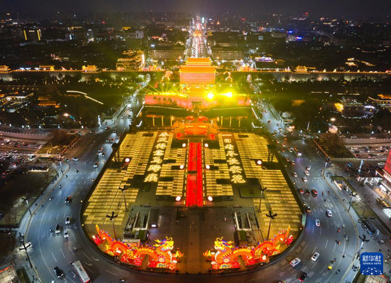 1月4日拍攝的西安城墻南門“長安燈會(huì)”景色(無人機(jī)照片)。
