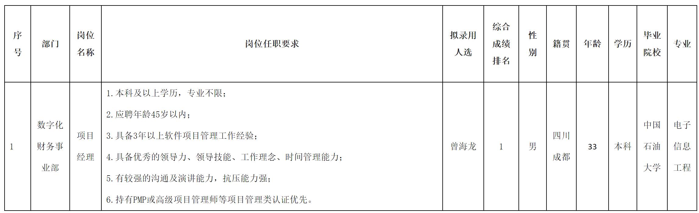 根據(jù)四川虹信軟件股份有限公司發(fā)布的招聘公告及招聘相關(guān)規(guī)定,經(jīng)測試、考察、體檢等程序,擬錄用曾海龍同志到四川虹信軟件股份有限公司工作,現(xiàn)予以公示,具體情況如下: