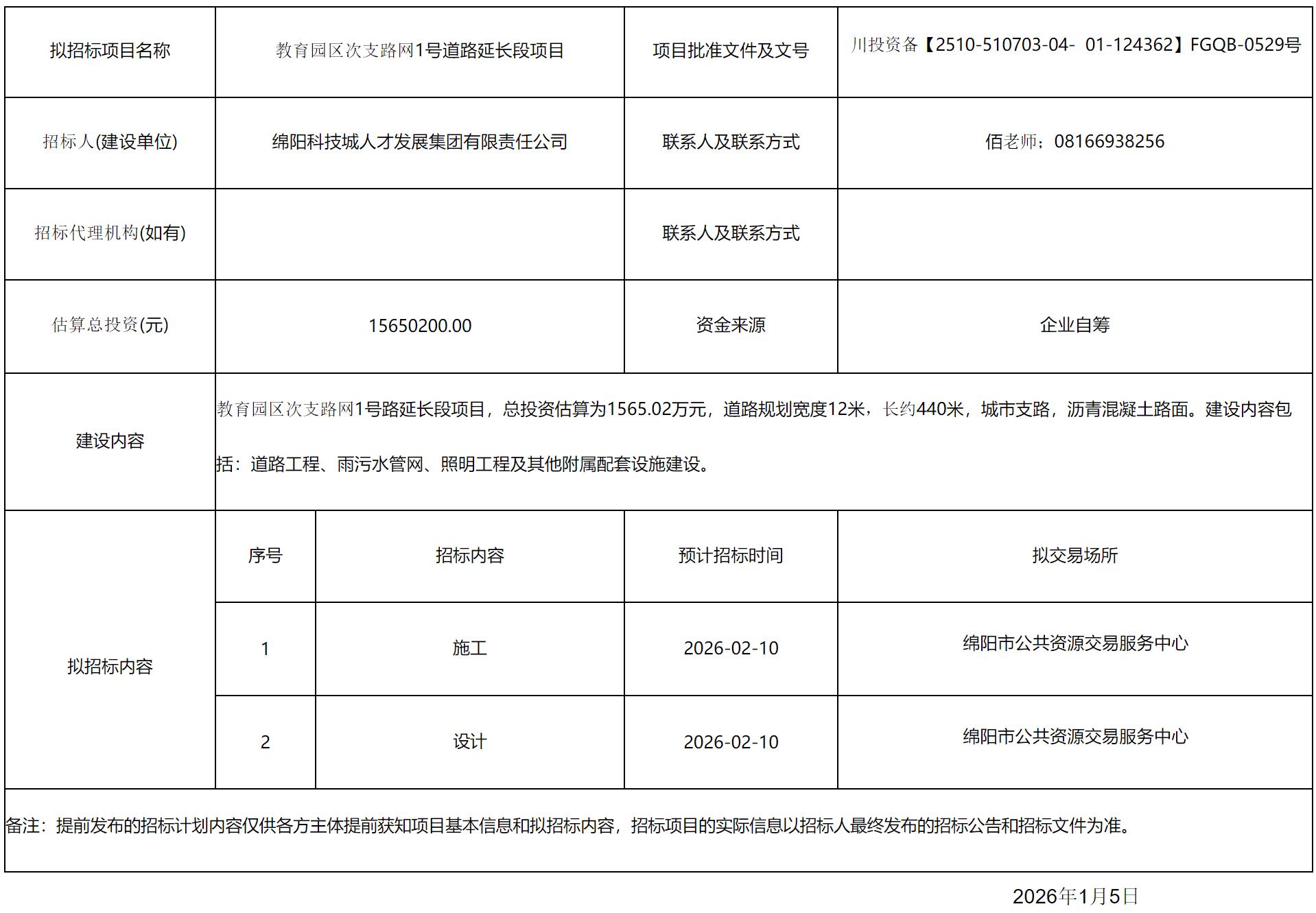 教育園區(qū)次支路網(wǎng)1號道路延長段項目招標計劃公告
