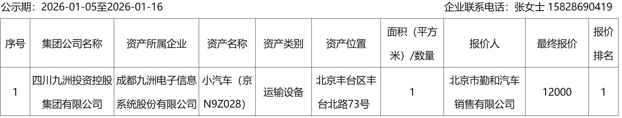 成都九洲電子信息系統(tǒng)股份有限公司資產(chǎn)處置結(jié)果公示