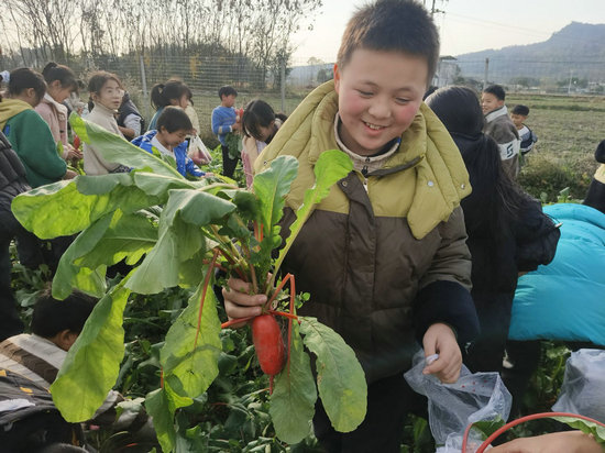 綠意盎然的田壟間,紅蘿卜探出鮮艷的頭部,白蘿卜圓潤的身子半掩于土中,翠綠纓葉隨風輕搖。學生們在老師的帶領下,一邊哼唱《拔蘿卜》,一邊熱火朝天地忙碌。隨著一顆顆飽滿的蘿卜破土而出,孩子們細心擰去莖葉,將成果整齊裝入袋中。不多時,就采收蘿卜1000多公斤。這些蘿卜將由學生帶回家中,與家人共享勞動收獲的喜悅。