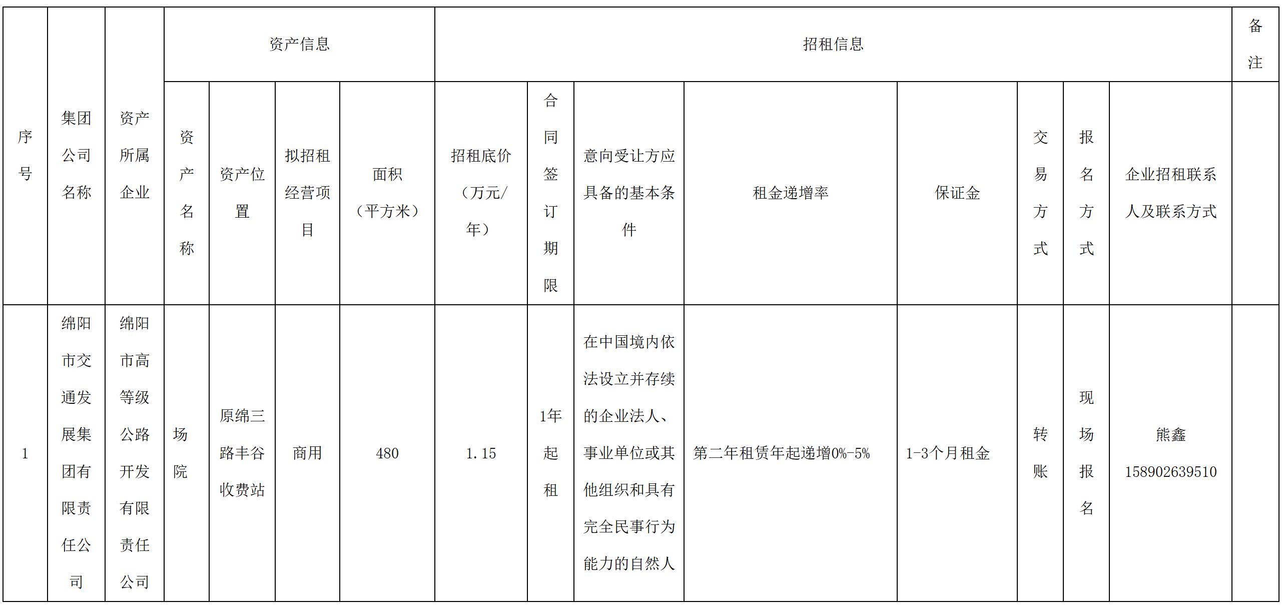 綿陽市高等級公路開發(fā)有限責(zé)任公司現(xiàn)有部分空置場院對外公開招租,歡迎有意向的單位、個體工商戶、自然人報名競價,現(xiàn)將相關(guān)事宜公告如下: