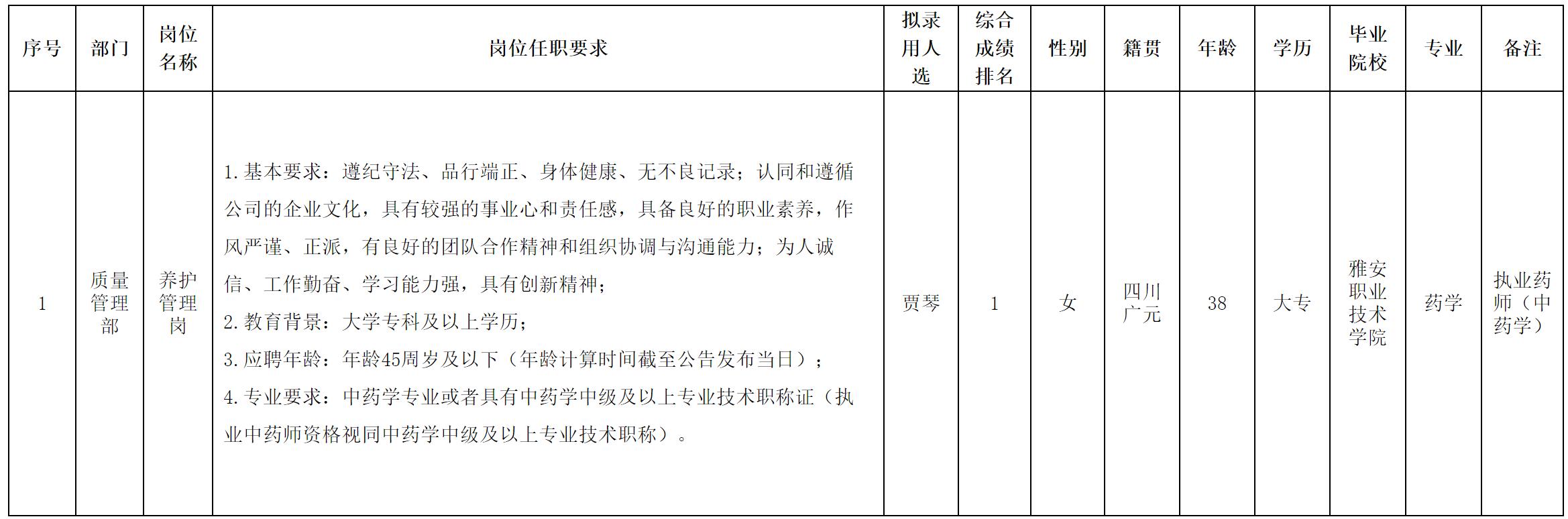 根據(jù)四川嘉來海川醫(yī)療科技有限公司發(fā)布的招聘公告及招聘相關(guān)規(guī)定,經(jīng)筆試、面試、背調(diào)、體檢等程序,擬錄用賈琴同志到四川嘉來海川醫(yī)療科技有限公司工作,現(xiàn)予以公示,具體情況如下: