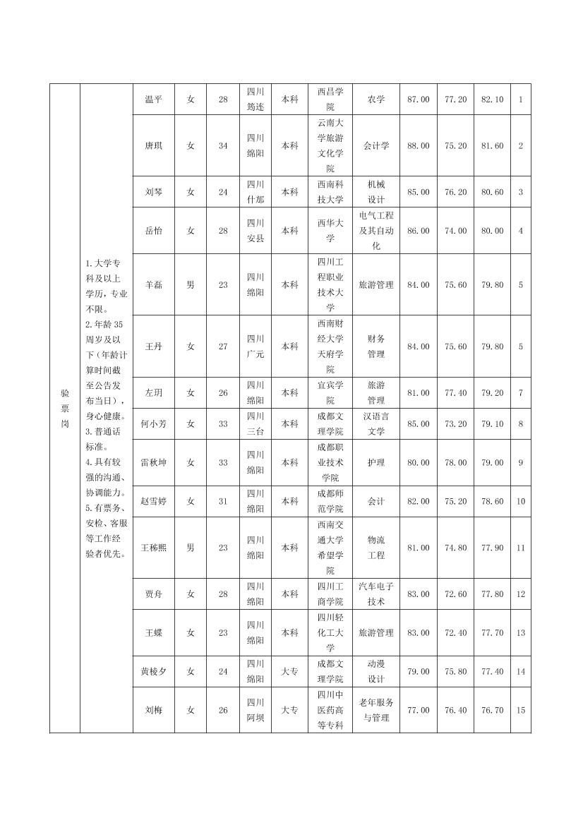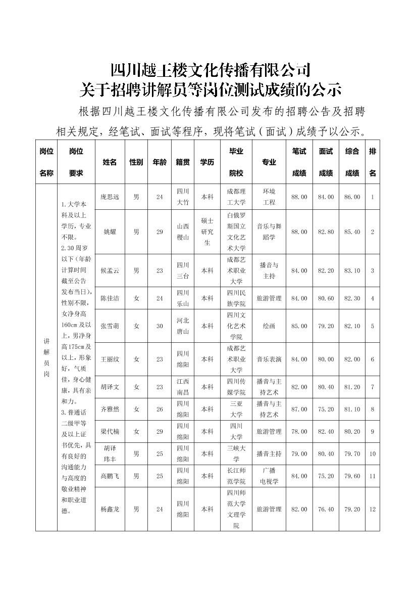 四川越王樓文化傳播有限公司關(guān)于招聘講解員等崗位測(cè)試成績(jī)的公示