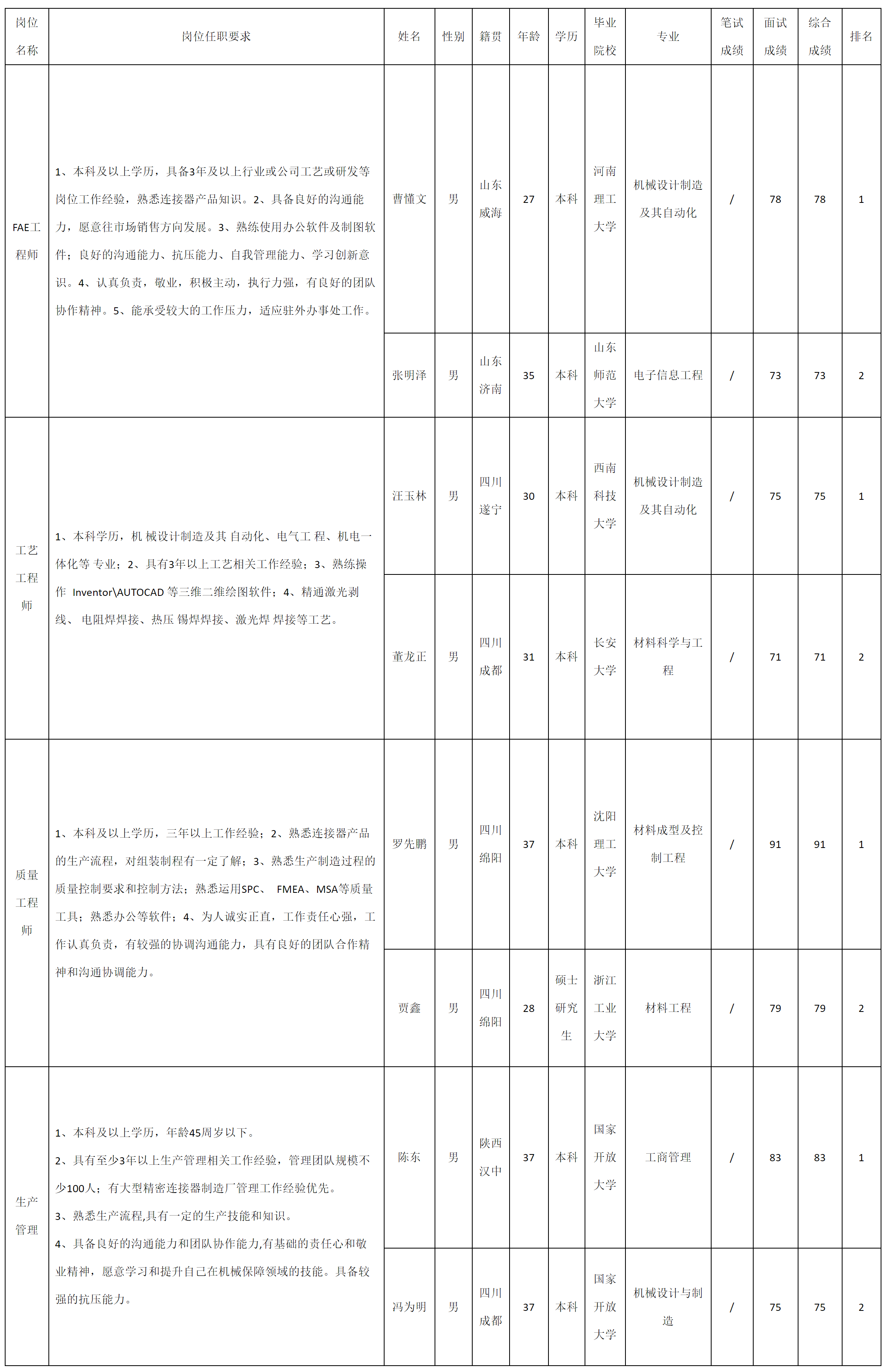 根據(jù)四川華豐科技股份有限公司發(fā)布的招聘公告及招聘相關(guān)規(guī)定,經(jīng)面試等程序,現(xiàn)將測(cè)試成績(jī)予以公示。