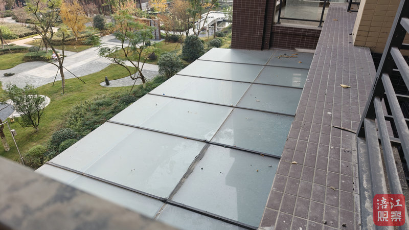 因樓下玻璃棚問題未解決,陸女士說,她至今尚未接房。