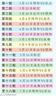 經(jīng)過(guò)現(xiàn)場(chǎng)抽簽,9支球隊(duì)分別抽到各自落位簽。綿陽(yáng)隊(duì)主場(chǎng)時(shí)間分別為:3月14日、4月4日、4月18日、5月1日、5月23 日、6月6 日、6月20 日、7月4日??倹Q賽第一輪第一場(chǎng)比賽計(jì)劃在3月14日舉行,由綿陽(yáng)隊(duì)主場(chǎng)對(duì)陣樂(lè)山隊(duì)。
